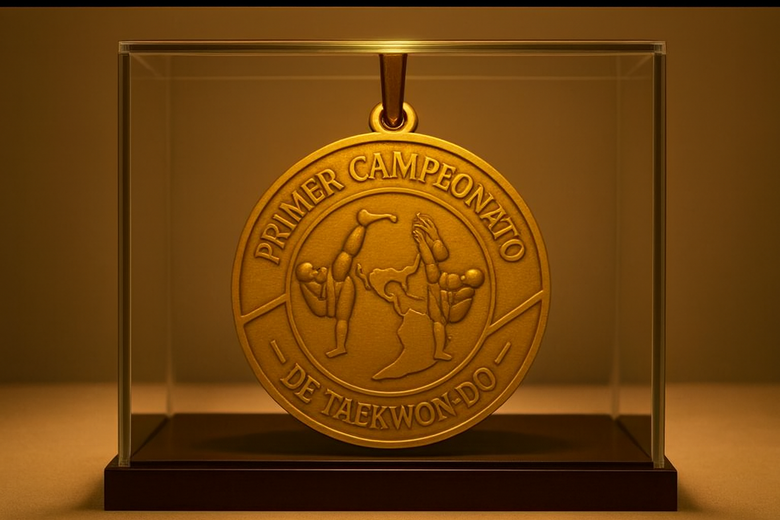 The First National Taekwondo Championships were held at Yale University in New Haven Connecticut in 1975 under the auspices of the USA Amateur Athletic Union.. First place winners received the gold medal shown here and comprised the first official USA National Taekwondo Team. That team went on to compete in the 2nd World Taekwondo Championships held in Seoul, Korea. Members of that team were William Felton, Gerard Robbins, Dennis Robinson, Terrance Watson, Gary Mule, Clark Murphy, Robert Phillips and Alternate John Holloway. Dennis Robinson won the individual bronze. All members of that team were inducted into the Official Taekwondo Hall of Fame®