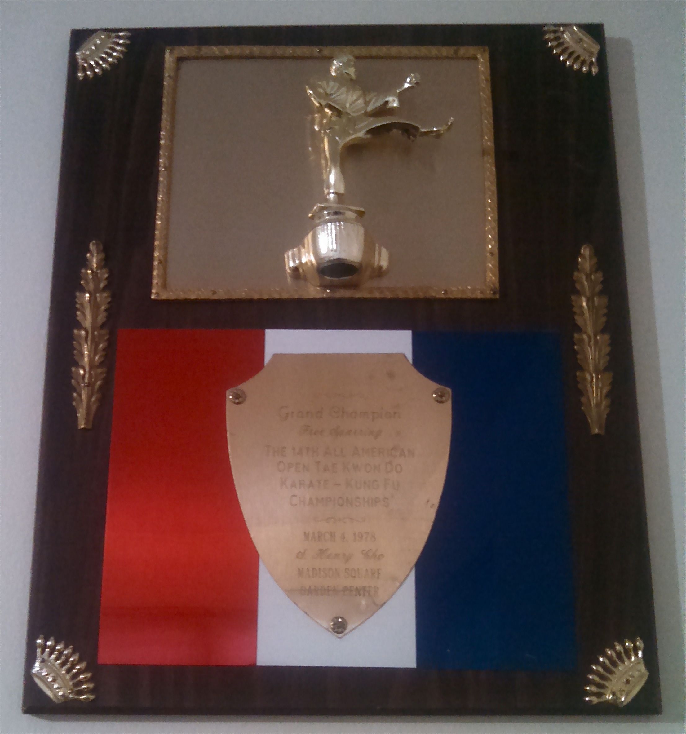 Henry Cho’s All American Open Taekwondo, Karate,and Kung Fu Championships was the most prestigious tournament held in North America during the early years of competition in North America. This plaque was presented to the Grand Champion in sparring in 1978 when the event was held at Madison Square Garden in New York City. Press the black arrow on the right side of the image to see the list of winners.